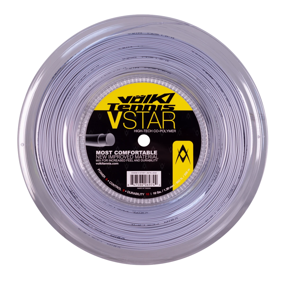 Volkl V-Star is a round poly with great durability and tension maintenance. V-Star delivers comfort and control with excellent response. the round shape of the string makes it a great option for hybrids and has great snap back as you come through shots. Great off the baseline, Volkl V-Star performs great and holds tension well for reliable performance.