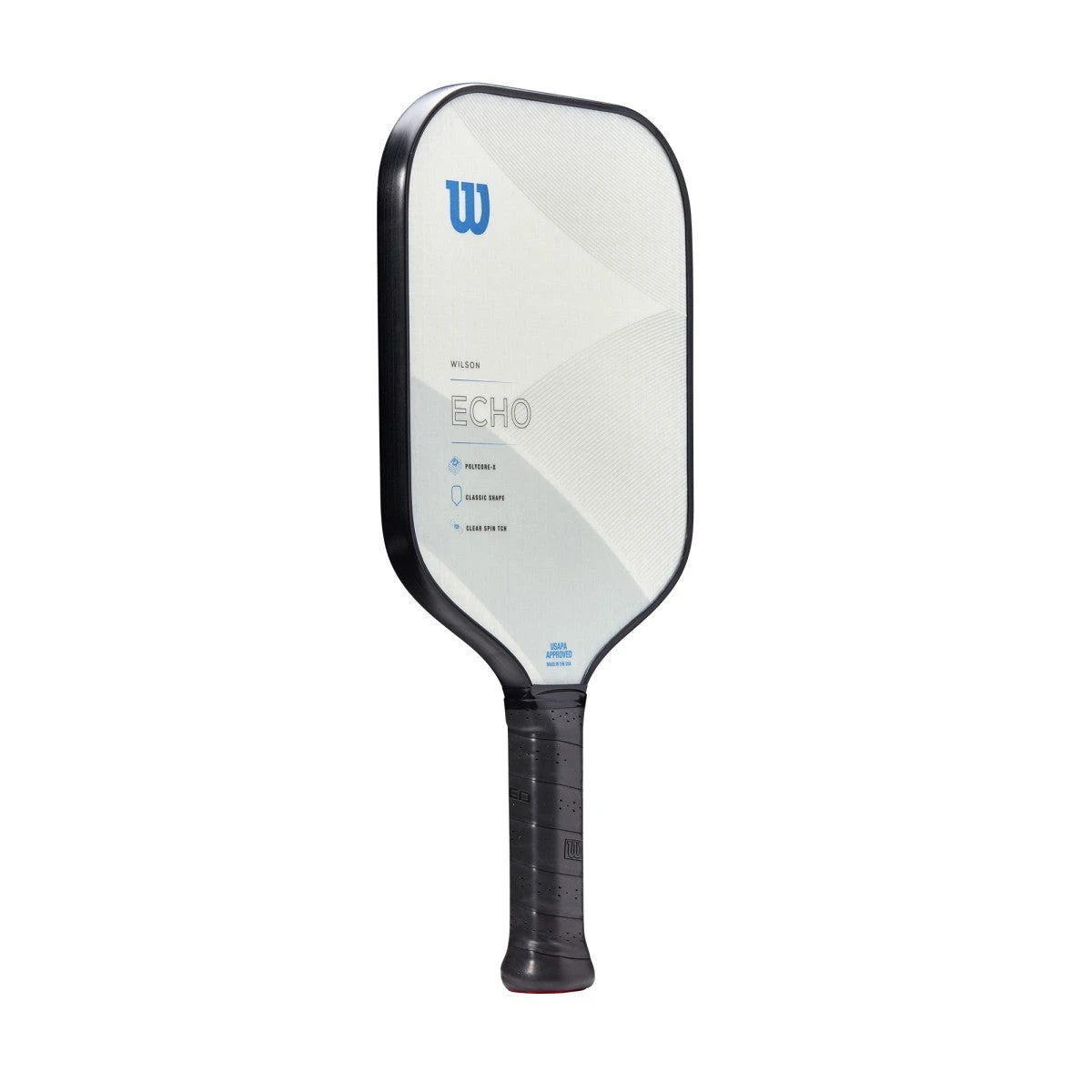 Wilson’s answer for players that want more on court, the Wilson Echo pickleball paddle delivers touch and feel perfectly. The Echo features an extended length handle to benefit players that like a two-handed backhand while the angled throat provides comfort and control on your shots. The honeycomb polymer core dampens vibrations but provides excellent feel. The hitting surface has Clear Spin TCH technology, a fiberglass composite that[s powerful and responsive.